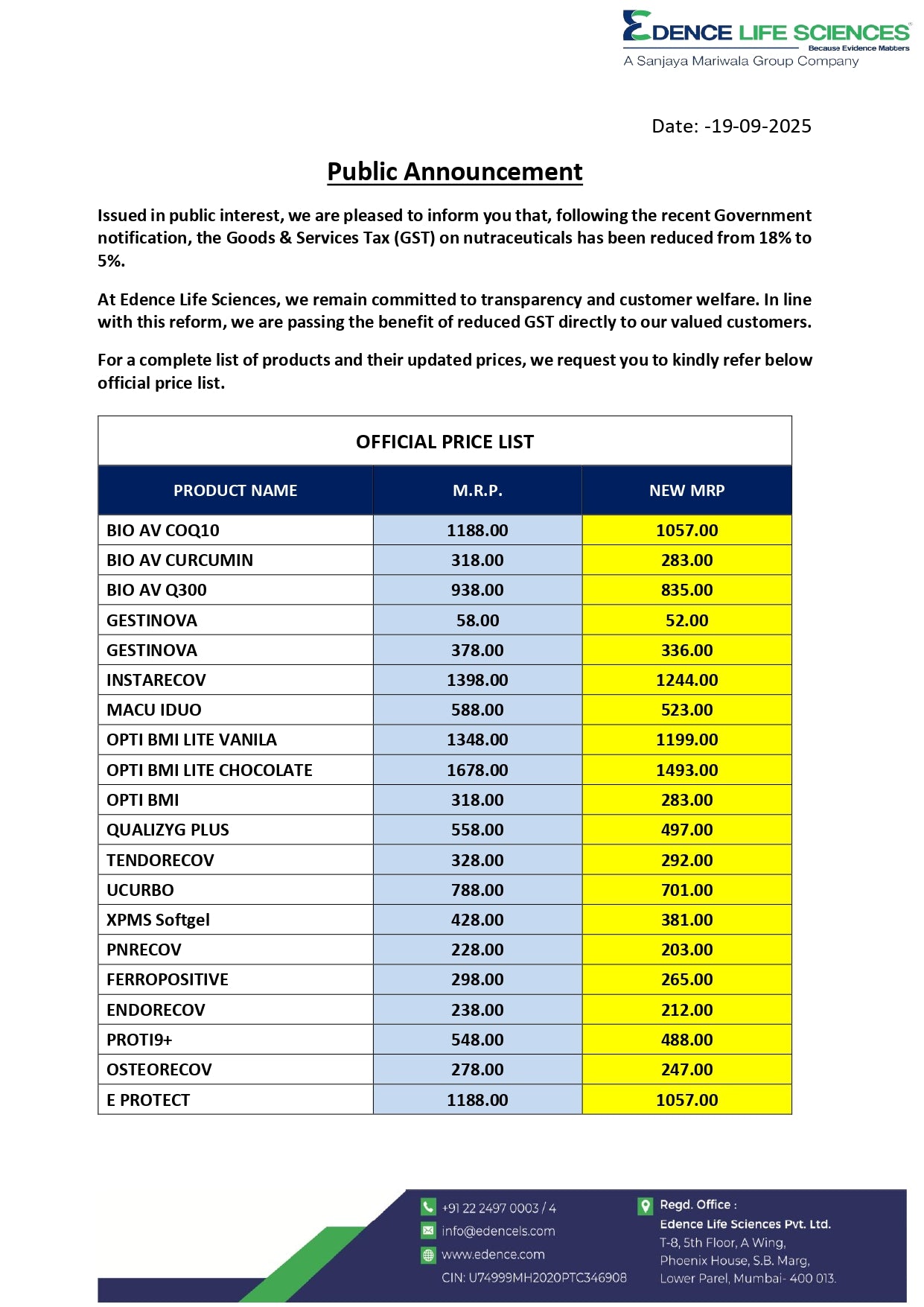Public Announcement: Following the recent Government notification, the Goods & Services Tax (GST) on nutraceuticals has been reduced from 18% to 5%.At Edence Life Sciences, we remain committed to transparency and customer welfare. In line with this reform, we are passing the benefit of reduced GST directly to our valued customers.